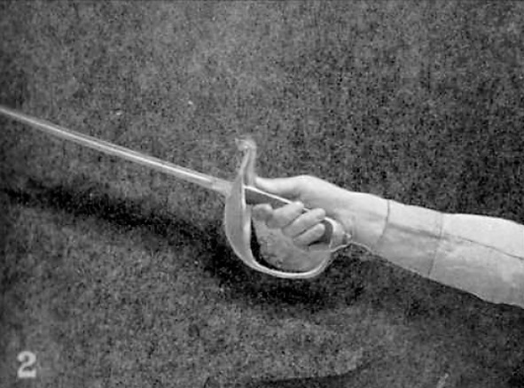 Возьмитесь за рукоять сабли так, чтобы последняя фаланга указательного пальца находилась приблизительно в полдюйма от гарды, а большой палец помещался сверху почти у гарды2. Верхняя часть рукояти должна опираться на нижнюю часть ладони и прижиматься к ее основанию так, чтобы немного выходить за ладонь, для обеспечения удобной «точки приложения» при управлении саблей, которое должно совершаться движением трех суставов руки по отдельности или в комбинации. Запястье следует изгибать только в боковом направлении, так как подвижность запястья может приводить к тому, что сабля отклоняется от направления удара или укола, а боковое движение запястья облегчает многие формы атаки (Рис. 1).