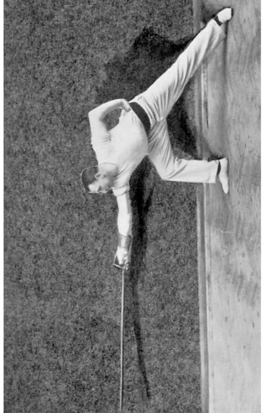 Равновесие должно сохраняться всегда, чтобы эффективнее противостоять эффекту от парирования противника и иметь возможность вернуться в защиту как быстро, так и точно. Из позиции «К бою», сохраняя левую ступню плотно прижатой к поверхности, выпрямить левую ногу, одновременно делая шаг правой прямо вперед на расстояние около 12 дюймов, правое колено перпендикулярно стопе, тело наклонено вперед, чтобы добавить силы и расстояния. Тело должно находиться на одной линии с левым плечом и левой пяткой. Рука и сабля удерживаются в положении «Вытянуть саблю». Ступни должны стоять на земле твердо и на всей стопе (рис. 6).