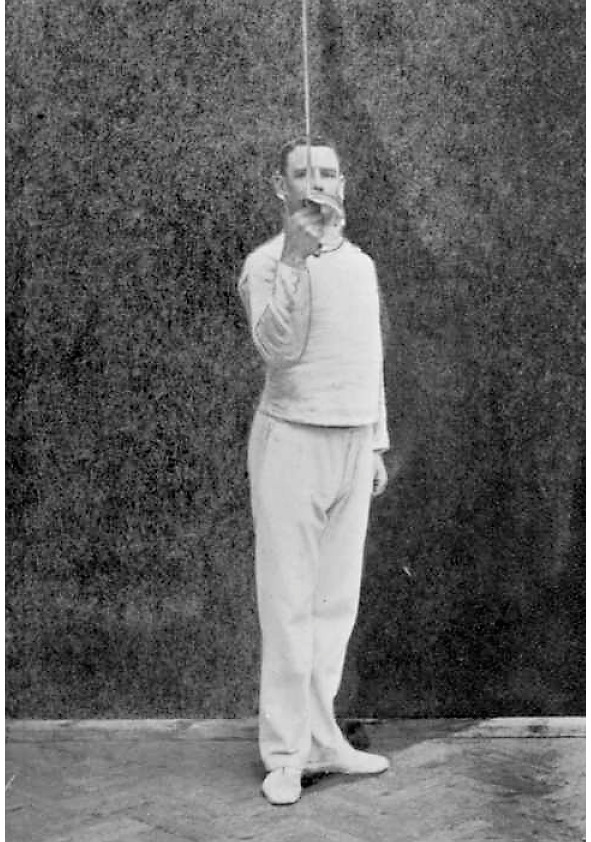 Поставьте ноги под прямым углом, правая нога должна быть направлена вперед, правая пятка – в центре левой стопы и касается ее, правый бок, голова и глаза направлены на противника. Рука у правого бедра и держит саблю, как описано, и так, чтобы рука и сабля были на одной линии и направлены от плеча вниз, лезвие клинка слегка поднято, на высоте около 8 дюймов от земли (рис. 3).
