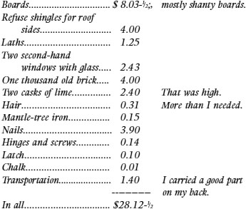 I have thus a tight shingled and plastered house, ten feet wide by fifteen long, and eight-feet posts, with a garret and a closet, a large window on each side, two trap doors, one door at the end, and a brick fireplace opposite. The exact cost of my house, paying the usual price for such materials as I used, but not counting the work, all of which was done by myself, was as follows; and I give the details because very few are able to tell exactly what their houses cost, and fewer still, if any, the separate cost of the various materials which compose them:—