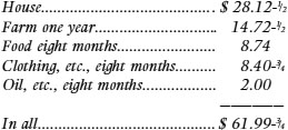 which subtracted from the sum of the outgoes leaves a balance of $25.21-3⁄4 on the one side – this being very nearly the means with which I started, and the measure of expenses to be incurred – and on the other, beside the leisure and independence and health thus secured, a comfortable house for me as long as I choose to occupy it.