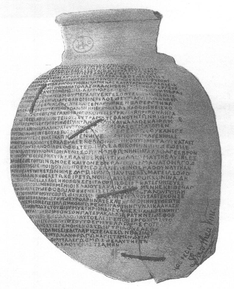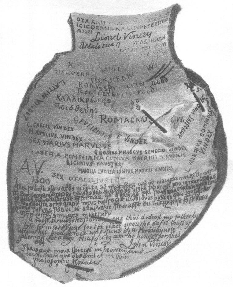 The next thing that I found was a parchment carefully rolled up. I unrolled it, and seeing that it was also in Vincey’s handwriting, and headed, “Translation of the Uncial Greek Writing on the Potsherd,” put it down by the letter. Then followed another ancient roll of parchment, that had become yellow and crinkled with the passage of years. This I also unrolled. It was likewise a translation of the same Greek original, but into black-letter Latin, which at the first glance from the style and character appeared to me to date from somewhere about the beginning of the sixteenth century. Immediately beneath this roll was something hard and heavy, wrapped up in yellow linen, and reposing upon another layer of the fibrous material. Slowly and carefully we unrolled the linen, exposing to view a very large but undoubtedly ancient potsherd of a dirty yellow colour! This potsherd had in my judgment, once been a part of an ordinary amphora of medium size. For the rest, it measured ten and a half inches in length by seven in width, was about a quarter of an inch thick, and densely covered on the convex side that lay towards the bottom of the box with writing in the later uncial Greek character, faded here and there, but for the most part perfectly legible, the inscription having evidently been executed with the greatest care, and by means of a reed pen, such as the ancients often used. I must not forget to mention that in some remote age this wonderful fragment had been broken in two, and rejoined by means of cement and eight long rivets. Also there were numerous inscriptions on the inner side, but these were of the most erratic character, and had clearly been made by different hands and in many different ages, and of them, together with the writings on the parchments, I shall have to speak presently.