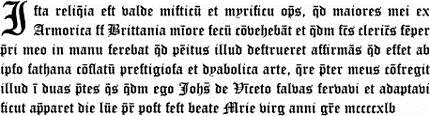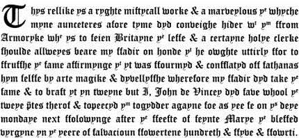 Then came what was perhaps as curious an entry as anything upon this extraordinary relic of the past. It is executed in black letter, written over the crosses or Crusaders’ swords, and dated fourteen hundred and forty-five. As the best plan will be to allow it to speak for itself, I here give the black-letter fac-simile, together with the original Latin without the contractions, from which it will be seen that the writer was a fair mediaeval Latinist. Also we discovered what is still more curious, an English version of the black-letter Latin. This, also written in black letter, we found inscribed on a second parchment that was in the coffer, apparently somewhat older in date than that on which was inscribed the mediaeval Latin translation of the uncial Greek of which I shall speak presently. This I also give in full.