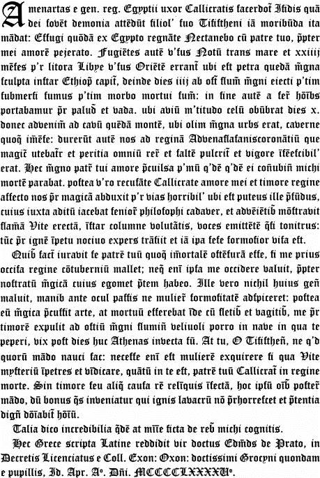 Amenartas, e genere regio Egyptii, uxor Callicratis, sac-erdotis Isidis, quam dei fovent demonia attendunt, filiolo suo Tisistheni jam moribunda ita mandat: Effugi quodam ex Egypto, regnante Nectanebo, cum patre tuo, propter mei amorem pejerato. Fugientes autem versus Notum trans mare, et viginti quatuor menses per litora Libye versus Ori-entem errantes, ubi est petra quedam magna sculpta instar Ethiopis capitis, deinde dies quatuor ab ostio fluminis magni ejecti partim submersi sumus partim morbo mortui sumus: in fine autem a feris hominibus portabamur per paludes et vada, ubi avium multitudo celum obumbrat, dies decem, donec advenimus ad cavum quendam montem, ubi olim magna urbs erat, caverne quoque immense; duxerunt autem nos ad reginam Advenaslasaniscoronantium, que magicâ utebatur et peritiá omnium rerum, et saltem pul-critudine et vigore insenescibilis erat. Hec magno patris tui amore perculsa, primum quidem ei connubium michi mortem parabat; postea vero, recusante Callicrate, amore mei et timore regine affecto, nos per magicam abduxit per vias horribiles ubi est puteus ille profundus, cujus juxta aditum jacebat senioris philosophi cadaver, et advenientibus mons-travit flammam Vite erectam, instar columne voluntantis, voces emittentem quasi tonitrus: tunc per ignem impetu nocivo expers transiit et jam ipsa sese formosior visa est.