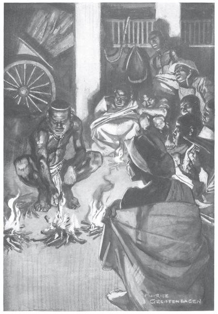 Мавово провел пером через правый из трех костров, внимательно осмотрел и отложил в сторону. Так продолжалось и дальше. Одно за другим он называл имена охотников, начав с себя как со старшего. Мавово проводил пером через костер, символизировавший судьбу упоминаемого охотника, внимательно осматривал перо и откладывал. После этого черный великан, казалось, снова погрузился в сон. Через несколько минут колдун очнулся, зевнул и потянулся, как человек, пробуждающийся от естественного сна.