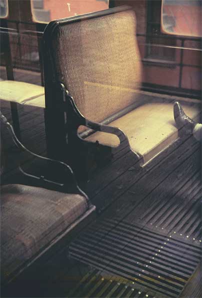 Сол Лейтер брал фотокамеру и выходил на прогулку. Так он гулял ежедневно, никуда не торопясь и не ожидая того, что обязательно увидит что-то исключительное. Он не ходил далеко, но если ты живешь и фотографируешь в центре Нью-Йорка, особо далеко уходить и не надо. Он шел от улицы к улице, от авеню к следующей авеню, иногда останавливаясь, чтобы сфотографировать абстрактную композицию, которая показалась ему занятной. Иногда он возвращался домой, не сделав ни одного кадра. Но иногда ему удавалось сделать замечательные снимки, как, например, вот этот, на которой изображен пустой вагон поезда и нога, лежащая на сиденье.