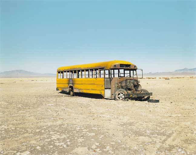 Работы из его серии «Песни пустыни» / Desert Cantos, вне всякого сомнения, можно назвать красивыми. Классическая композиция кадра, сделанного при идеальном освещении, огромный формат распечатки, на которой видна каждая, даже самая мелкая деталь изображения, – но при этом фотограф снимает предметы, которые далеко не все сочтут красивыми. На этой фотографии изображен остов школьного автобуса в пустыне. Судя по всему, автобус пришел в такое плачевное состояние не после нападения на него террористов. Скорее всего, этот автобус – символ мирного детства – использовали во время учебных стрельб американских военных в пустыне Невада. По мнению фотографа, самое эффективное использование красоты происходит только тогда, когда с ее помощью изображают неприглядные стороны жизни.