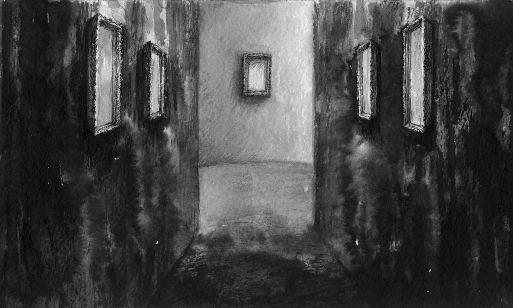 Эстаф поднял голову и посмотрел перед собой. Перед ним медленно, словно испарившись, исчезала часть стены, за которой становился виден длинный узкий коридор. По стенам висели небольшие лампы, освещая пространство вокруг, и картины под ними – на каждой стене по две друг напротив друга. Стены и пол, были сочно-черного цвета и затянуты бархатной тканью. Лампы горели красноватым светом, который постепенно начал становиться ярче и перешел в желтый, еще сильнее осветив коридор. В конце коридора вдруг зажегся свет, и Эстаф увидел по ту сторону большое круглое помещение. В самом конце его, прямо по линии, висела большая позолоченная рама с чистым, без изображения холстом. Эстаф приподнялся и медленно зашагал вперед. Три шага, и он вошел в коридор. Дойдя до первой картины, он остановился и только повернул голову, чтобы посмотреть на нее, как вдруг изображение пропало. Эстаф отвернул голову, но краем глаза заметил, что изображение вновь появилось. Снова взглянув на картину, Эстаф увидел лишь чистый холст. Дотронувшись до него и ощутив приятную поверхность холста, Эстаф пошел дальше. Изображения на остальных картинах при попытке взглянуть на них так же терялись. Игра в прятки манила и увлекала, несмотря на всю свою диковинность и странность. Любопытство взяло верх, и Эстаф решил исследовать следующий зал.