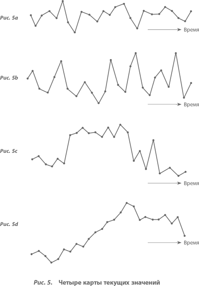Предположим, что в некотором процессе мы систематически регистрируем во времени результаты измерений. Измеряемыми величинами могут быть длина стального прутка после операции обрубки, или затраты времени на обслуживание машины, или ваш собственный вес до приема пищи, или процент дефектных (не попавших в допуски) в партии от поставщика, или коэффициент интеллекта, или время между выставлением счета и получением денег и т. д. На рисунках 5a–5d показаны четыре примера записи данных (карты текущих значений), регистрируемых в ходе измерений. В каждом примере время изменяется вдоль горизонтальной оси, а чем выше расположена точка на вертикальной оси, тем больше размер, длина, запаздывание и вообще все то, что мы регистрируем в этот момент.