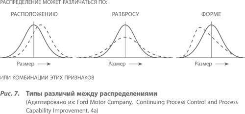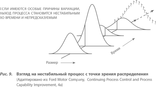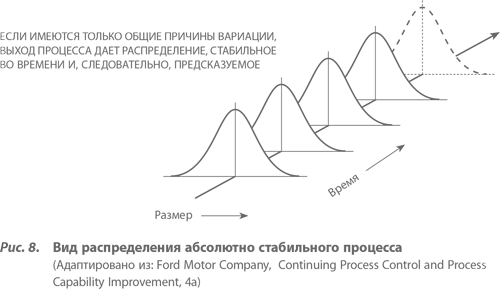 Ключевая фраза для понимания рисунка 6 – «если сам исходный процесс стабилен» – напрямую связана с понятием статистически управляемого процесса. Идея заключается в том, что если в ходе измерений на процессы оказывает влияние некоторое постороннее воздействие (например, по отношению к приведенным выше примерам: настройка машины изменилась, норма обслуживания для механика по наладке увеличилась, вы сели на диету, ваш поставщик стал использовать сырье плохого качества и т. д.), то результаты измерений не могут рассматриваться как происходящие из одного и того же источника, и, таким образом, никакое стабильное распределение нельзя использовать для его представления. На самом деле, как мы увидим позже, определение стабильности, представляемое единственным фиксированным распределением, слишком идеализировано с практической точки зрения (позже мы будем ссылаться на эту искусственно-идеальную ситуацию как на представляющую идеально точную стабильность).