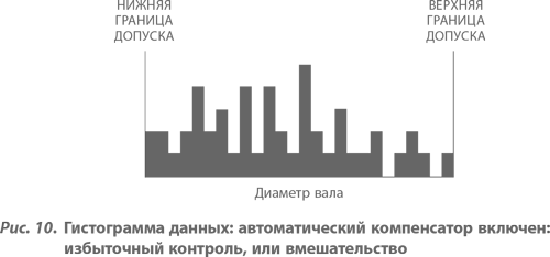 Поскольку без компенсирующего прибора разброс (вариабельность) уже находился на минимально возможном уровне, вмешательство, производимое прибором, оказывалось тем внешним воздействием, о котором мы говорили ранее. Единственный возможный эффект такого внешнего влияния – увеличение вариаций, разброса – эффект, совершенно противоположный желаемому. Конечно, если бы имелись особые причины разброса, компенсатор помог бы смягчить их эффект. Но в отсутствие особых причин он мог только ухудшить выход процесса. Можно показать, что в этом случае компенсационный прибор увеличивал вариабельность более чем на 40 %.