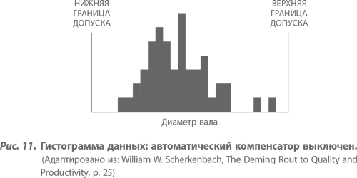 Ответ заключался в том, что технологический процесс без работающего компенсирующего прибора уже был в управляемом состоянии, т. е. проявлял наименьший разброс, на какой он был способен, поэтому имелись только общие причины вариаций. Уменьшение этого разброса достигается только улучшением самого процесса. Компенсатор не улучшал процесса. Он лишь вмешивался в процесс, который уже был стабилен. («Вмешательство» – это собственный термин Деминга.)