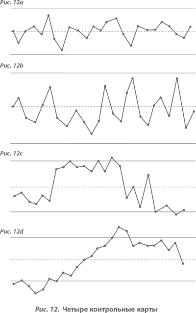Правило Шухарта заключается в том, что действия, соответствующие наличию особых причин вариаций, должны предприниматься в тех случаях, когда наносимые точки выходят за любую из контрольных границ. В соответствии с критериями Нельсона предлагается принятие таких мер при появлении и других типов «сигналов», как, например, расположение девяти последовательных точек по одну сторону от центральной линии либо непрерывное уменьшение или увеличение наблюдаемой величины в шести последовательных точках. Контрольные карты для данных на рисунках 5a–5d, показанные на рисунках 12а–12d[29], подтверждают качественные суждения, сделанные нами ранее касательно того, какие из этих процессов находятся, а какие не находятся в управляемом состоянии.