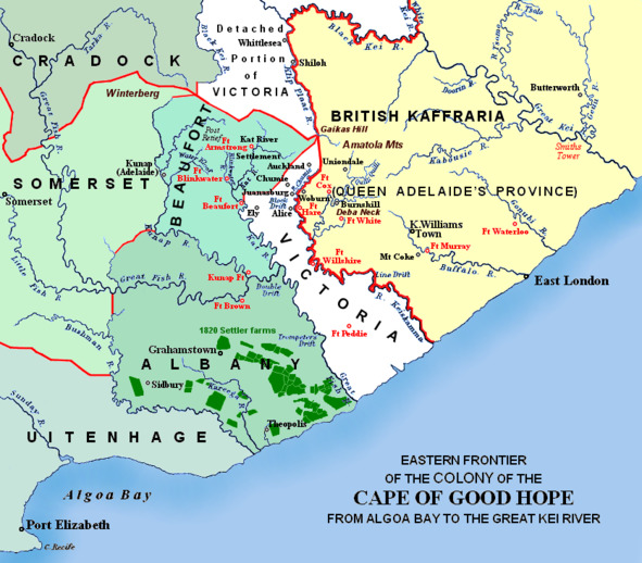 Именно здесь кафры причинили нам такие неприятности во время последней войны, потому что густые кустарники у дороги давали им бесчисленные возможности подстерегать, атаковать и преследовать караваны фургонов и части войск, которые постоянно использовали эту дорогу. Здесь был использован единственный реальный шанс поймать туземных врагов во время войны в открытом поле, и этот шанс не упустили. Пикет 7-го драгунского полка атаковал и пресле-довал замеченного врага. Будучи пойманными, кафры заявили, что солдаты-кавалеристы, должно быть, все были вождями из-за размера и красоты их лошадей.