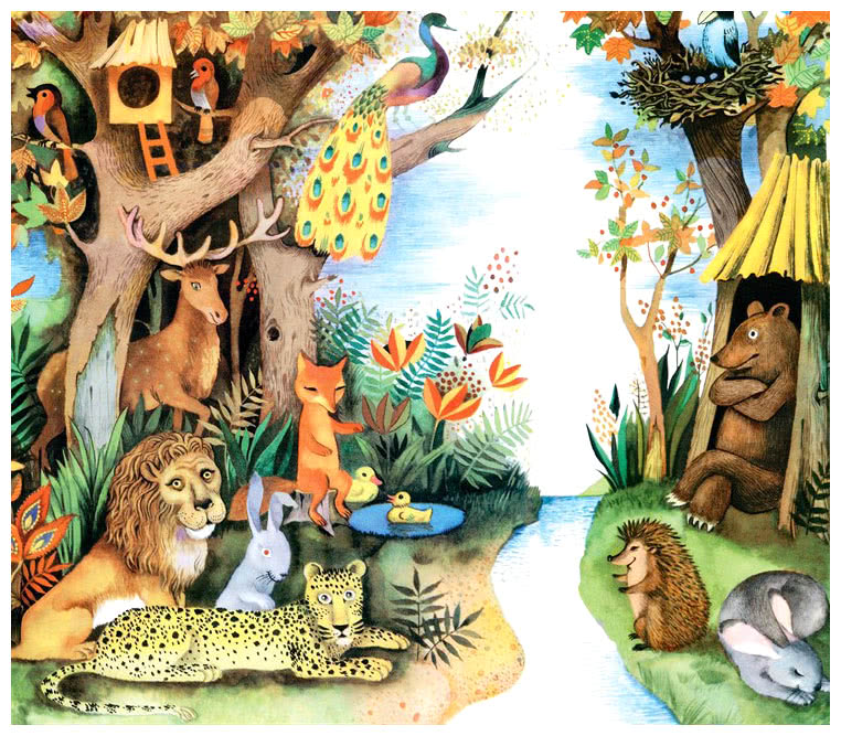 В леса-чудесаМы поедем с тобой.Там бродит у озераЛось голубой.Там чащу хвостомПодметает Лиса,Чтоб чистыми былиЛеса-чудеса.
