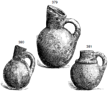 Рис. 379–381. Кувшины шаровидной формы, с одной ручкой. (1:4 натуральной величины. Найдены на глубине от 22 до 32 футов)
