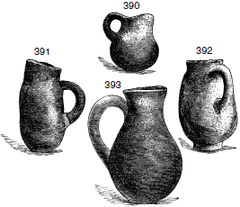 Рис. 390–393. Кувшины разных форм. (1:4 натуральной величины. Найдены на глубине от 22 до 26 футов)