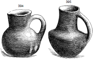 Рис. 394, 395. Кувшины различной формы. (1:4 натуральной величины. Найдены на глубине от 22 до 32 футов)
