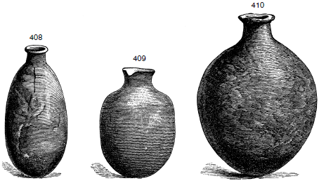 Рис. 408–410. Бутыли из терракоты. (1:4 натуральной величины. Найдены на глубине от 25 до 29 футов)