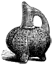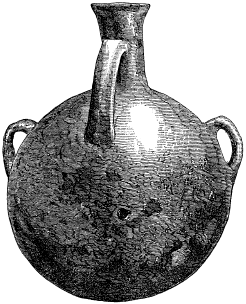 Терракотовые бутыли ручной работы (рис. 434–436) темно-красного или коричневого цвета, чечевицеобразной формы и напоминают наши охотничьи фляжки. У сосуда с рис. 434 нет ручек, и он украшен четырьмя выступами, похожими на груди; другие две – с двумя ручками. Бутыль с рис. 435 украшена вокруг горлышка выпуклой полосой, орнаментированной вертикальными насечками. Терракотовые бутыли аналогичной формы, найденные в древних египетских гробницах, хранятся в египетских коллекциях Британского музея и Лувра. Коллекция кипрских древностей в Британском музее также содержит множество образцов подобной формы, но с несколько более длинным носиком. В ассирийской коллекции Британского музея также есть значительное количество подобных терракотовых бутылей, найденных в Нимруде и других местах.