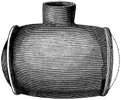 Рис. 440. Любопытный сосуд-треножник в форме бочонка. (1:4 натуральной величины. Найден на глубине 23 фута)