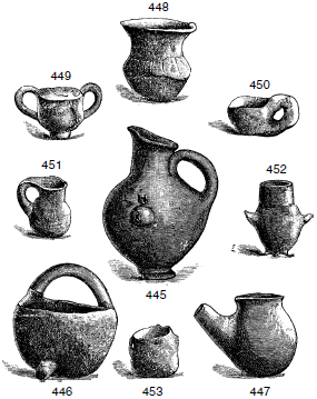 Рис. 445–453. Бутылочки для кормления детей, чаши и т. д. (1:4 натуральной величины. Найдены на глубине от 19 до 26 футов)