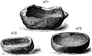 Рис. 471–473. Небольшие, похожие на лодочки чашки из высушенной на солнце глины. (Почти половина натуральной величины. Найдены на глубине от 22 до 26 футов)