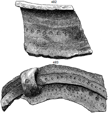 Рис. 482, 483. Фрагменты большой красной вазы с любопытным штампованным орнаментом. (Почти 1:5 натуральной величины. Найдены на глубине 26 футов)