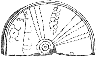 Рис. 484. Крышка вазы из терракоты с прочерченным орнаментом, воспроизводящим дерево, оленя и, возможно, каракатицу. (Половина натуральной величины. Найдена на глубине 26 футов)
