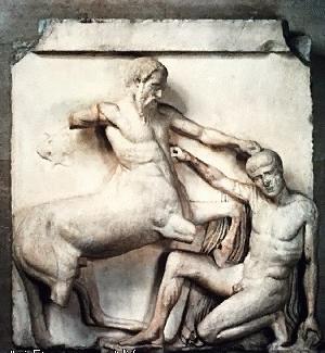 Долго шел пир, не смущаемый ничем. Но в середине его Эвритион, самый дикий и самый сильный из всех кентавров, отуманенный вином, вдруг поднимается со своего места, бросается на Ипподамию и, схватив ее за волосы, увлекает за собою. Следуя его примеру, и остальные кентавры бросились на присутствовавших на пиру женщин и повлекли их за собою. Быстро вскочили с своих мест лапифы и другие герои Эллады; бросились они на похитителей, и пошел в брачных чертогах Пирифоя дикий, ожесточенный бой, какой бывает на улицах города, в который ворвались неприятельские войска. Самые мужественные и могучие из героев Эллады ратовали против грубой силы и зверской дикости кентавров. Тезей напал на Эвритиона: