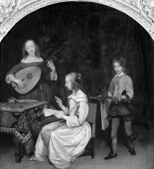 Мы даем здесь описание не просто случайной ситуации: вся сцена повторяется, и она настолько типична, что, переходя к анализу фигур и их размещения, мы можем продолжать оперировать теми же понятиями. Посмотрите на обнаженную руку музицирующей дамы у Терборха: как тонко прочувствованы ее изгиб и движение, и насколько тяжеловеснее кажется форма Метсю – не потому, что рисунок ее хуже, а потому, что он выполнен иначе. У Терборха группа построена легко и между фигурами много воздуха, у Метсю она массивна и сдавлена. Мы едва ли можем найти у Терборха такое нагромождение, как эта откинутая толстая ковровая скатерть с письменным прибором на ней.