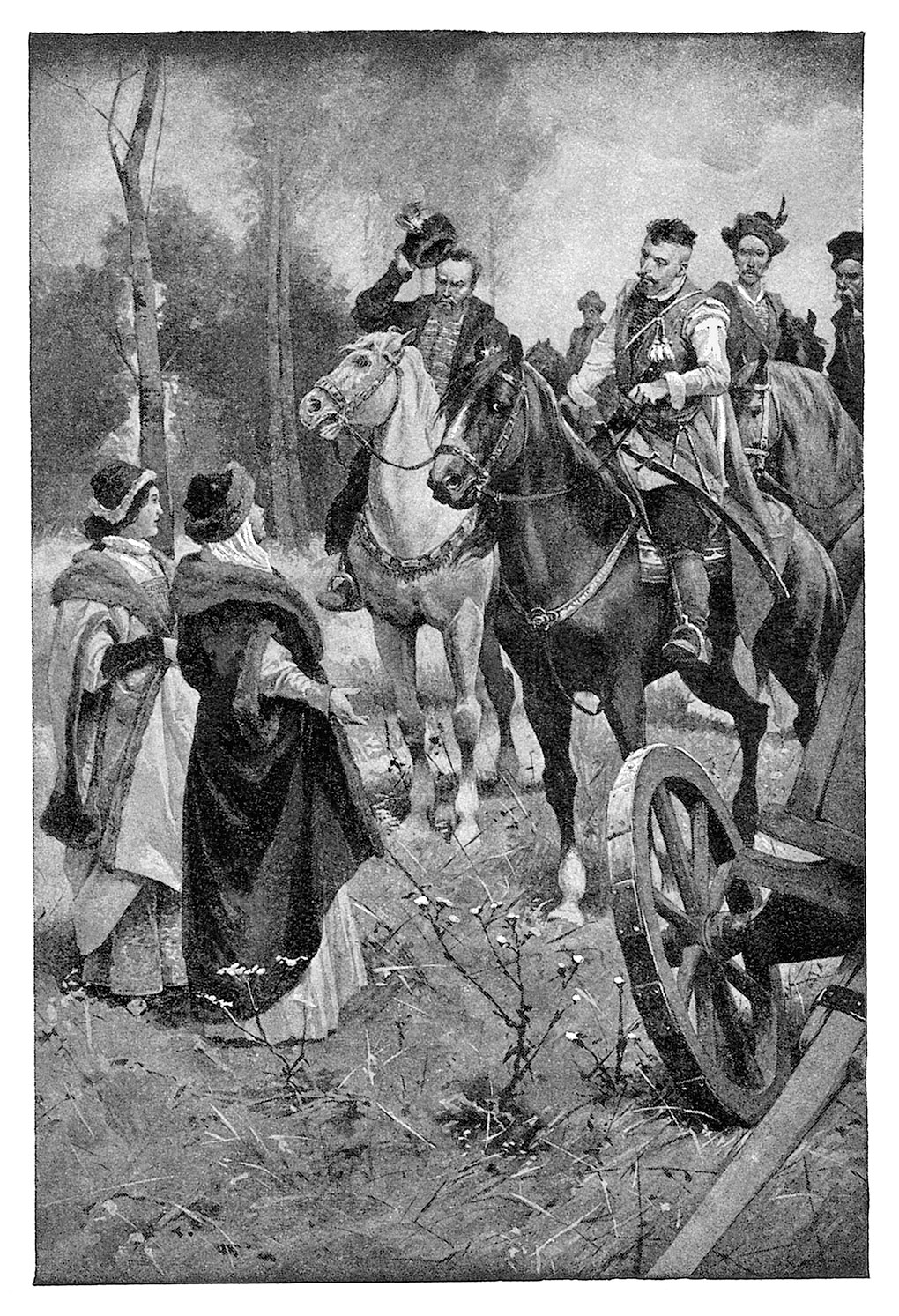 – Рыцарь, кем бы вы ни были, не откажите в помощи дамам, оказавшимся в затруднительном положении на дороге и не знающим, что предпринять. До дому осталось мили три, но в колымаге полопались оси, и нам, похоже, придется ночевать в поле; возницу я послала к сыновьям, чтобы хоть телегу сюда прислали, но пока возница доедет и вернется, сделается темно, а в урочище этом оставаться страшно, потому что тут могилы поблизости.