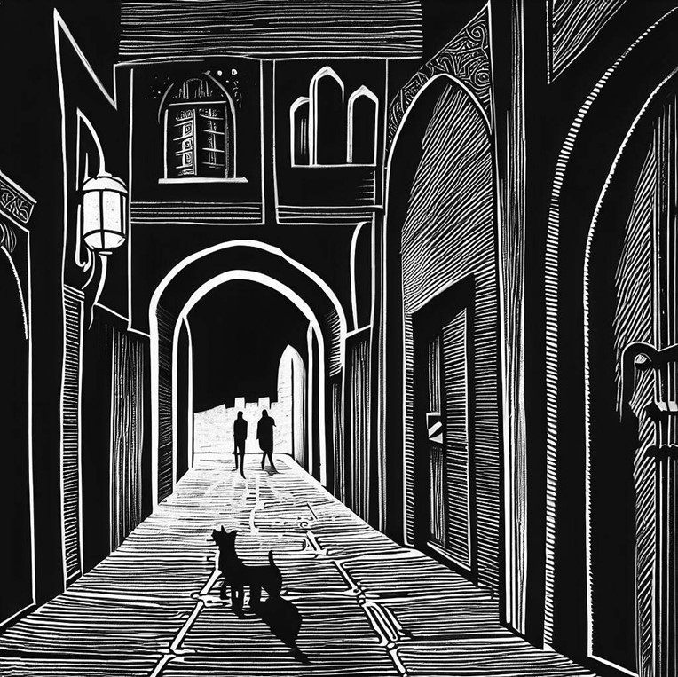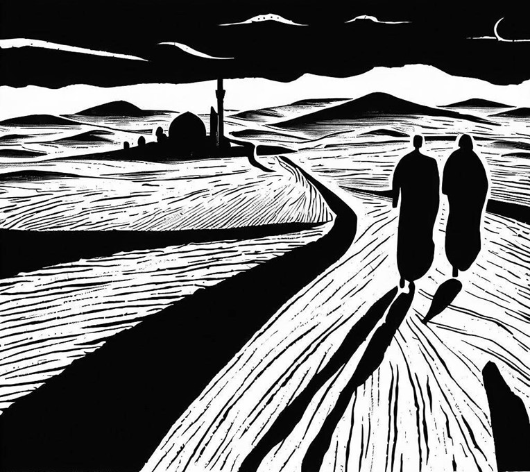 Неподалеку, над голыми холмами струится жаркое марево, из которого вырастают воздушные белые купола и невысокая квадратная башня минарета. Горячий пустынный ветер вздымает мелкую пыль. Она проникает под одежду, забивается в легкие, вызывая судорожный сухой кашель. И без того расплывчатый, пейзаж теряет свои очертания от слез, наворачивающихся на глаза из-за пыли, и мы не сразу замечаем двух путников. Один облачен в белую галабию, второй одет по-европейски, в свободный черный костюм. Взаимодополняющие и взаимоотрицающие друг друга, приближаются они к могиле великого пророка. Мир растерял свои краски, остались лишь две черно-белые фигуры и бесноватый серый смерч, кружащийся волчком посреди гигантской шахматной доски.