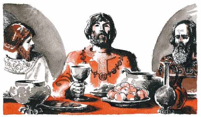 Потчует князь Дмитрий гостей едой и винами. Песнями тешит, жалует.