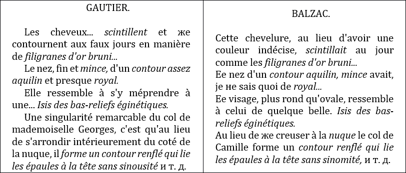 O Inca! о roi infortuné et malheureux!Поэт, написавший много романов под разными псевдонимами и впоследствии отрекшийся от них, прежде чем усвоить себе вообще известный слог, выдержал жестокую и упорную борьбу, силясь овладеть французскою прозою. Юные романтики, последователи Гюго, долго не хотели признать в нем истинного художника, и это было тернием на его жизненном пути. Готье, обладавший тонким чутьем и признававший его талант, был единственный писатель, порадовавший его своим уважением. Но изумлению Бальзака не было границ, когда он видел, как молодой Готье, без всякой подготовки и затруднения, без малейших поправок писал статьи, прекрасные по форме и по содержанию, просто на конторке в типографии. Сначала он думал, что у Готье статьи уже готовы в уме, но потом убедился, что для искусного изложения мыслей требуется врожденный талант, которого у него нет. А как он трудился, чтобы приобресть эту способность! Как он указал Готье, когда вполне выработалась пластическая и художественная сторона его слога! Доказательства этому можно привести и из такого позднего времени, как 1839 г. В изображении главных женских типов своего романа «Béatrix» Бальзак почти слово в слово заимствует целые выражения из статьи Готье, появившейся годами двумя раньше (об актрисах мадемуазель Жорж и Женни Колон). Сравните сами: