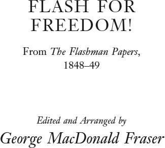 When the Flashman Papers were brought to light at Ashby, Leicestershire, in 1965, it was noted that while the great volume of manuscript had obviously been examined and re-arranged round about 1915, no alteration or amendment had been made to the text as set down by Flashman himself in 1903–1905. Closer examination of the third packet reveals, however, that an editorial hand has been lightly at work. I suspect that it belonged to Grizel de Rothschild, the youngest of Flashman’s sisters-in-law, who with a fine Victorian delicacy has modified those blasphemies and improprieties with which the old soldier occasionally emphasised his narrative. She was by no means consistent in this, for while she paid close attention to oaths, she left untouched those passages in which Flashman retails his amorous adventures; possibly she did not understand what he was talking about. In any event, she gave up the task approximately half way through the manuscript, but I have left her earlier editing as it stands, since it adds a certain period charm to the narrative.
