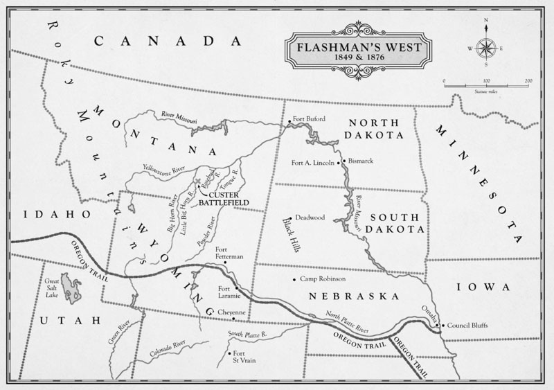 It was obvious from the early Papers that Flashman, in the intervals of his distinguished and scandalous service in the British Army, visited America more than once; this seventh volume is his Western odyssey. I believe it is unique. Others may have taken part in both the ’49 gold rush and the Battle of the Little Bighorn, but they have not left records of these events, nor did they have Flashman’s close, if reluctant, acquaintance with three of the most famous Indian chiefs, as well as with leading American soldiers, frontiersmen, and statesmen of the time, of whom he has left vivid and, it may be, revealing portraits.
