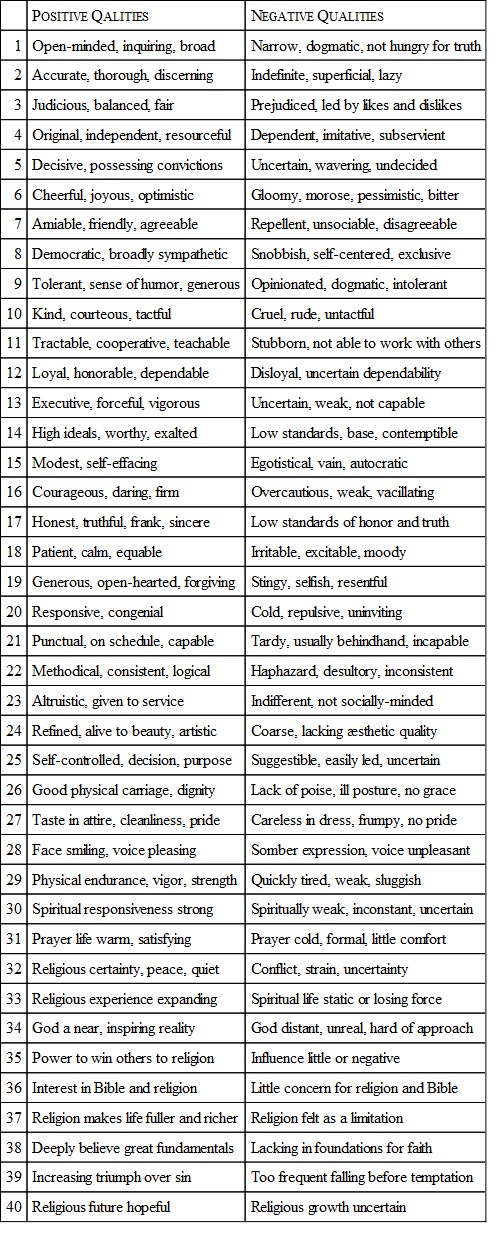 A character chart.—There is no possibility, of course, of making a list of all the qualities that enter into our personalities. Nor would it be possible to trace all the multiform ways in which these qualities may combine in our characters. It is worth while, however, to consider a few of the outstanding traits which take first place in determining our strength or weakness, and especially such as will respond most readily to conscious training and cultivation. Such a list follows. Each quality may serve as a goal both for our own development and for the training of our pupils.