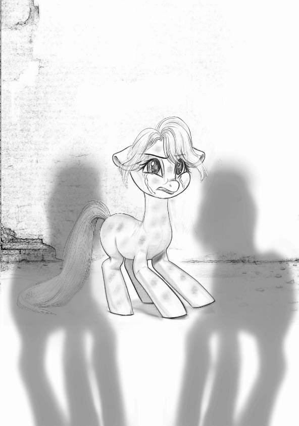 Арон уже собрался возвращаться домой, как вдруг заметил жеребенка черно-белого окраса на пару лет младше его самого. Тонкие ноги малыша дрожали, а золотые глаза расширились от страха перед четырьмя крупными серыми жеребцами. Их рваные жилетки с плащами кричали о том, что они из низших слоев. Неотесанные кони угрожающе ухмылялись и безотрывно зыркали красными глазищами на пятнистого малыша.