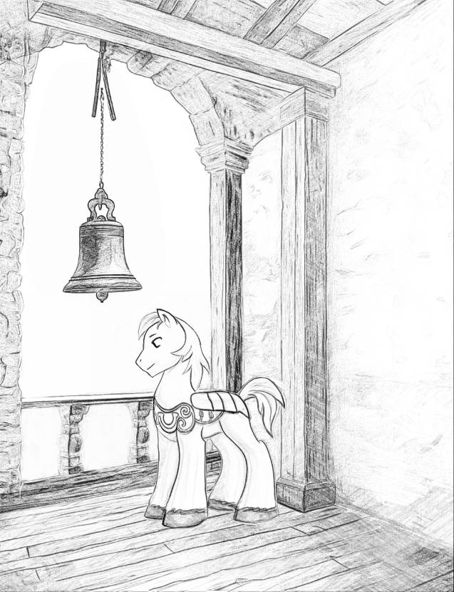 Выйдя из казармы, жеребята покрались за Бурогривом по коридору с фресками, перешептываясь. Сегодняшняя ночь обещает веселье. Ученики с неистовым восторгом глядели на картины с рыцарскими подвигами. Напротив одной остановились. На ней было изображено здание, напоминающее кирпичный дом с детских рисунков, построенное из белого песчаника и с черепичной крышей.