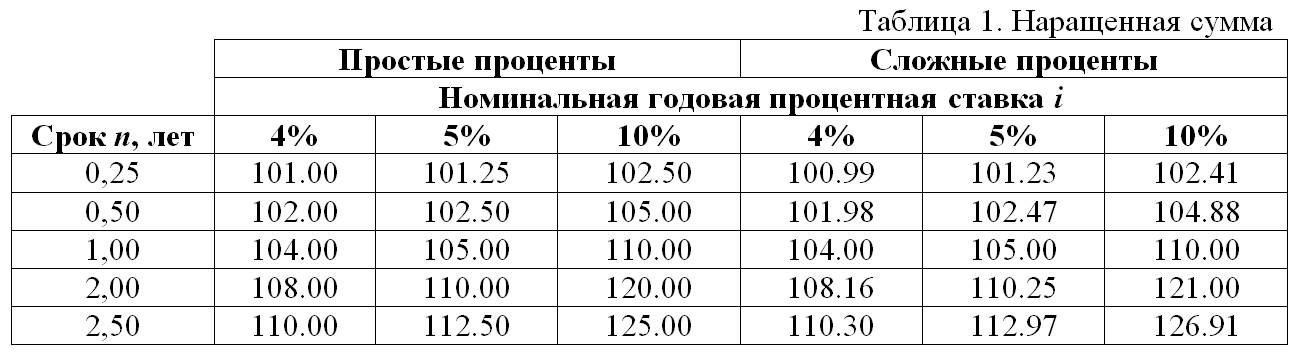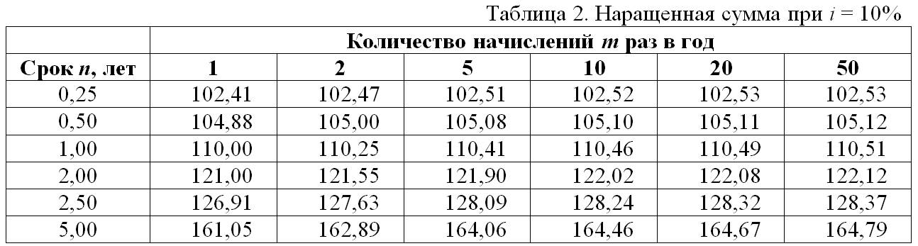 Сделаем иллюстративной расчет для случая P = 100 руб., различных сроков n и значений процентной ставки i. Полученные значения наращенной суммы S приведены в Таблице 1.