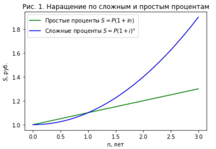 Для полного понимания изобразим на Рис. 1 график зависимости S(n) для сложных и простых процентов.