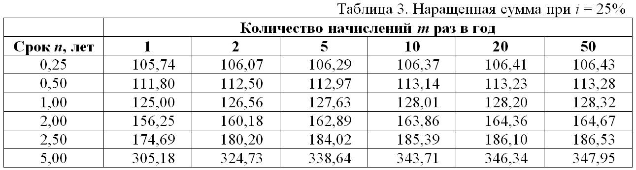 Дня того, чтобы продемонстрировать зависимость наращенной суммы от количества начислений m раз в год, сведем в Таблицы 2 и 3 результаты расчетов при Р = 100 руб. и ставке i = 10% в Таблице 2 и ставке i = 25% в Таблице 3.