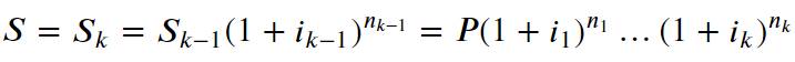 Из полученной формулы можно сделать следующие выводы. Размер наращенной суммы не зависит от порядка чередования периодов с различными процентными ставками. Кроме того, если в два или более периода имело место одна и та же процентная ставка, то для целей расчета наращенной суммы их можно объединить в один период, длительность которого равна сумме длительностей исходных.