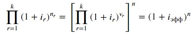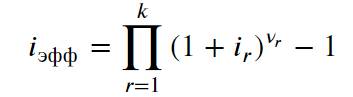 Здесь νr = nr / n – доля промежутка nr в полном сроке рассматриваемого кредита. Получается, что для случая с переменной процентной ставкой можно ввести понятие эффективной процентной ставки сложных процентов, рассчитываемой как взвешенное произведение процентных ставок каждого периода, и которую можно использовать как единый эквивалент для расчета наращенной суммы: