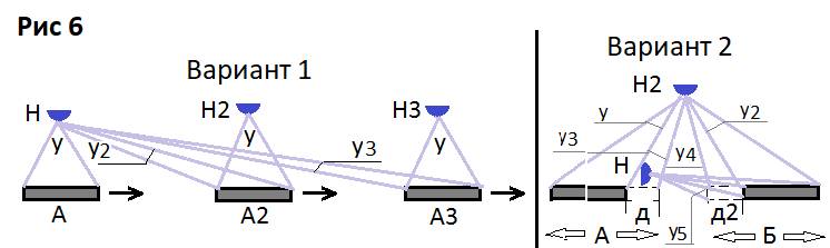 Ж). Проблемы наблюдений. (Рис 6, Вариант 1). Тело (А), перемещаются в пространстве (А 2, А3). Наблюдатель, находится в точке (Н) над телом (А). По мере удалённости тела (А 2 на А3) от наблюдателя (Н), угол зрения уменьшается (У 2, У3). Таким образом, видимые размеры тела уменьшаются, что противоречит реальности (искажённая информация). Если наблюдатель будет перемещаться вместе с телом (Н 2, Н3), то перемещение тел не будет фиксироваться (скрытая информация). Следовательно: Вариант 1, не даёт объективной оценки. В Варианте 2, Два тела (АБ) синхронно совершают маятниковые перемещения (д, д 2), приближаясь, и удаляясь друг от друга. Наблюдатель (Н), находится на теле (А), и перемещается вместе с телом. Следовательно, не может фиксировать перемещение (А) тела (д). Наблюдатель (Н), видит только схождение и расхождение тел. Поэтому, величина перемещения (д) зрительно прибавляется к перемещению (д 2), тела (Б). Наблюдатель (Н), видит то, что на самом деле не существует, перемещение тела (Б), в два раза больше реального (ложная информация)! Эта ошибка, и была отражена в не столь давние времена в