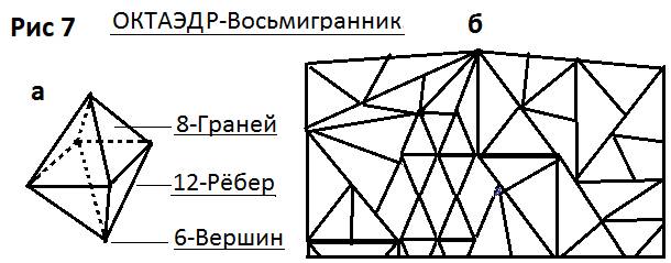 Известно, что минимальный объём информации байт, равен 8 бит. 1 байт = 8 бит. Можно логически предположить, что первичный информационный блок, образует объёмную фигуру восьмигранник (октаэдр) (рис 7а). Следовательно, общая информация состоит из блоков разных размеров, (б) которые гармонично вложены как матрёшки, друг в друга, и так же имеют многогранную, кристаллическую структуру. Например: А). 1 килобайт (Кб) =1024 байта. Б). 1 мегабайт (Мб) =1024 Кб. В). 1 гигабайт (Гб) = 1024 Мб. И так далее. Каждый блок, какой бы сложной формы и объёмом небыл, по сути, является кодом (комбинация из информаций), определённого состояния материи (б) «Байт-Код». Во внутренней области Байт-Кода (октаэдр), находится информационная память (комбинации). Грани (8 шт.), служат для передачи информаций. Рёбра (12 шт.) выполняют функцию приёма информаций. Вершины Байт-Кода, как и вся поверхность, несут задачу механического сцепления с другими кристаллами. Плотное