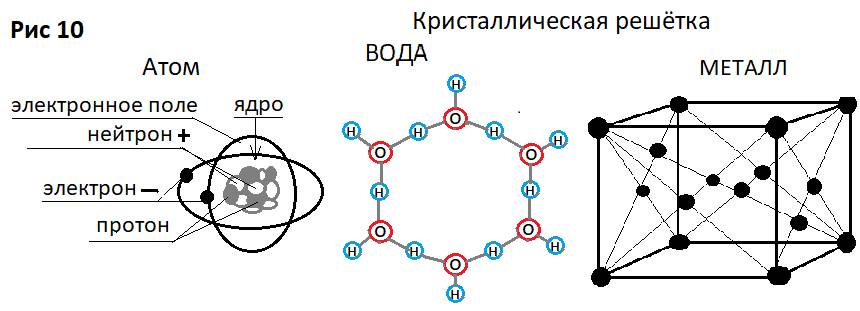 Атом. Продолжение создания мира: Возрастающая вибрация (энергия) эфира и плотность фотонов, концентрировались, сливаясь в пространстве (вихрь), что порождали нейтроны, протоны. Нейтроны, протоны в свою очередь составили ядра водорода, гелия. Ядра, образовав вокруг себя электронное поле (облако), составили атом (Рис 10). Ядро имеет положительный заряд, электронное поле, отрицательный заряд. Группы атомов чередуются положительными и отрицательными зарядами. Электронное поле, взаимодействуя с соседними электронными полями, создаёт атомные решётки вещества (Рис 10). Но, при этом сам электрон, в десятки тысяч раз меньше ядра. Соединения атомов в решётки по программе Байт-Код (физические законы), создавали молекулы газов, жидкости, вещества, из молекул образовывались газопылевые облака, основу звёзд и планет. Итак: Строение кристаллических решёток, определяет физические свойства вещества. Ядро атома, по сути, является как на воде «воронкой» засасывающий окружающий эфир. При движении эфира, возникает трение между гранулами эфира, что порождает электрический заряд. Чем сильнее движение эфира, тем мощнее электрический заряд питающий атом. Значит: Чем ближе к ядру атома, тем выше электрический заряд эфирных гранул, при этом; чем дальше от ядра, тем плотность электронного поля атома, уменьшается. Некоторые данные: Если ядро атома увеличить до 5мм, то атомное поле (облако), увеличится до 1000м. (1км). Тоесть атомное поле примерно в 200 000 раз больше ядра! Это