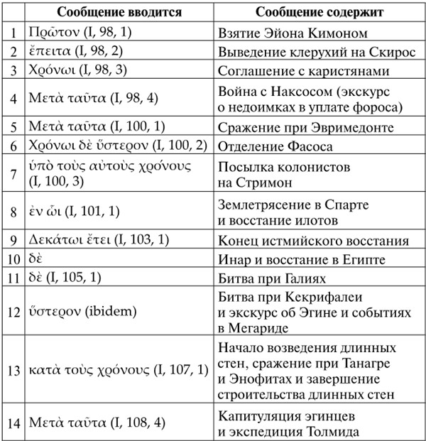 В анализируемом тексте у Фукидида наличествует, в сущности, только одно сообщение, которому не предшествует указание на время. Это разделенный на две части очерк о событиях в Египте (I, 104; I, 109–110). Его вторая часть, включенная в текст после сообщения об экспедиции Толмида, начинается без какого бы то ни было введения и как будто продолжает непрерывный рассказ (С.А.Жебелёв погрешил против текста ради понятности изложения и перевел эту фразу: «Между тем афиняне и их союзники все еще оставались в Египте», в то время как она говорит всего лишь: «Афиняне же и союзники оставались в Египте»). Этот очерк содержит ряд интересных подробностей. Так, например, в нем сообщается, что Мемфис делится на три части (μέρος 1, 104), одна из которых называлась Λευκòν τεῖχος (ibidem), о ней сообщает и Геродот (Herod. III, 91; ἐν τῶι Λευκῷ τείχεϊ τῶι ἐν Μέμφι); о государстве ἐν τοῖς ἕλεσι (I, 110, 2; в болотах) и том, что его жители, которых Фукидид называл ἕλειοι, были наиболее воинственными из египтян (ibidem; καὶ ἅμα μαχιμώτατοι εἰσι τῶν Αἰγυπτίων οἱ ἕλειοι) и т. д. Заканчивается рассказ о событиях в Египте заключением, аналогичным концовке повествования о Фемистокле и Павсании (I, 138, 6): τὰ μὲν κατὰ τὴν μεγάλην στρατείαν Ἀθηναίων καὶ τῶν ξυμμάχων ἐς Αἴγυπτον οὕτως ἐτελεύτησεν (I, 110, 5; так закончился большой поход Афинян и союзников в Египет). Это заключение (τὰ μὲν κατὰ… ἐτελεύτησεν) можно, как нам представляется, считать такой же заключительной формулой рассказа, какой является обязательная формула окончания года καὶ… ἔτος τῶι πολέμωι ἐτελεύτα τῶιδε ὃν Θουκυδίδης ξυνέφραψεν (II, 70; III, 88, 116; V, 116, 135 и т. д.).