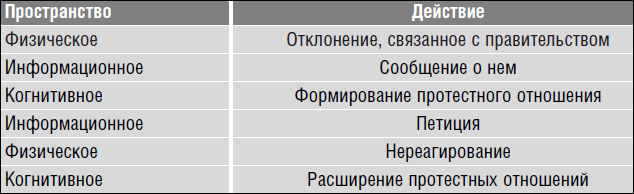 Принятым в рамках революций способом введения нестабильности является усиленная социальная нестабильность, создаваемая в информационном и когнитивном пространствах. При этом действия в физическом пространстве рассматриваются чисто коммуникативно как форма выражения одного значения – социальной нестабильности. Общественное неповиновение в виде блокирования административных зданий является физическими действиями, несущими соответствующее символическое значение – непризнание авторитета власти.
